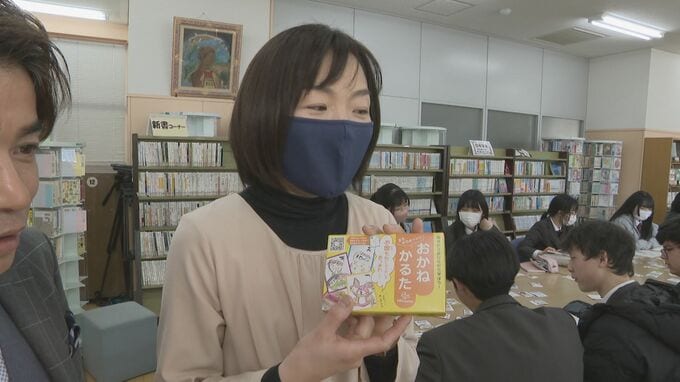 「これは『おかねかるた』というもので、お金に関する読み札と絵札になっている。お金に興味を持ってもらうために使っています」