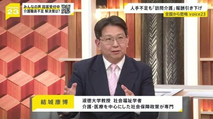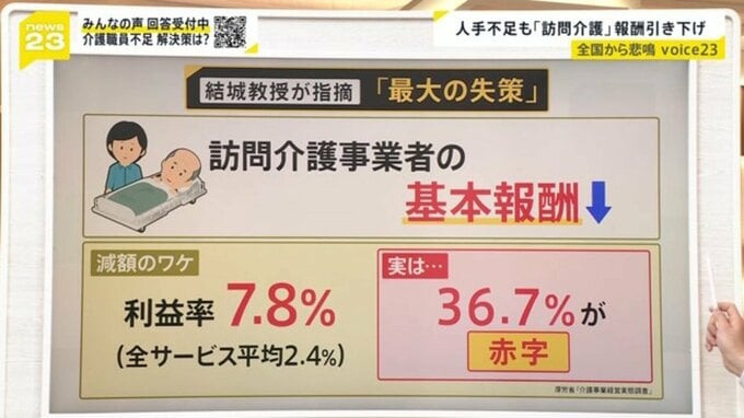 結城教授は国の政策が「最大の失策」と指摘しています。それは訪問介護事業者の基本報酬の減額です。