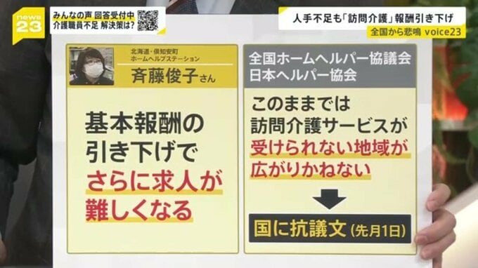 北海道・倶知安町の介護事業所「ホームヘルプステーション」の斉藤俊子さんは「基本報酬の引き下げでさらに求人が難しくなる」と話しています。