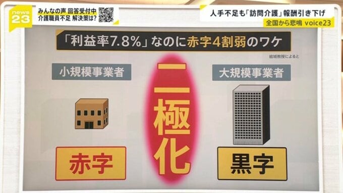 大きな訪問介護事業所は組織化されているので、収益が良いのですが、地域密着の小規模事業所は大変な状況です。国はそこをきちんと分けて、介護報酬を決めないといけなかった。雑だったというのが原因だと思います。