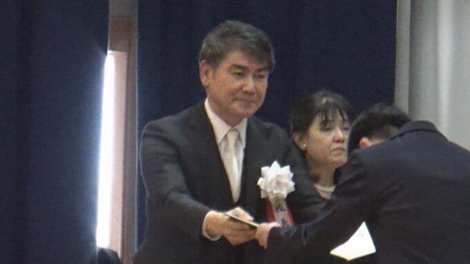 少し緊張した面持ちで、名前を呼ばれると檀上に上がっていく生徒たち。その卒業生1人1人に卒業証書を手渡すのは平良亮校長です。この季節によく目にするこの光景ですが、1つだけいつもと異なる点があります。実は手渡されている卒業証書は平良校長が一から書き上げたものです。