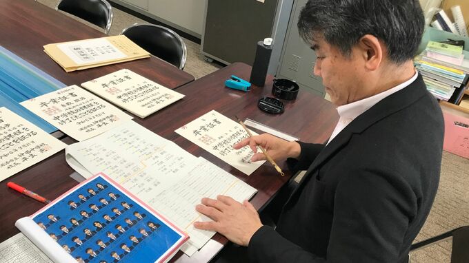 「生徒全員の顔と名前が一致するわけじゃないですけど、朝の挨拶だったり、行事だったりで声をかけたり話をしたりして、部活などで活躍している生徒もいますから。名前を書く時には顔写真を見て、『この子はこんな生徒だったな』と気持ちを込められたらなと思って書いています」