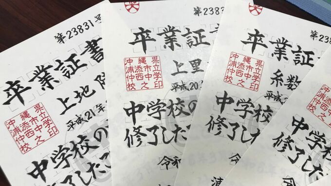 その後、連絡を取るも「まだまだ進んでいない」という返事だった平良校長。卒業式まであと6日。学校を訪ねると、卒業証書はまだ完成しておらず作業を進める校長の姿がー