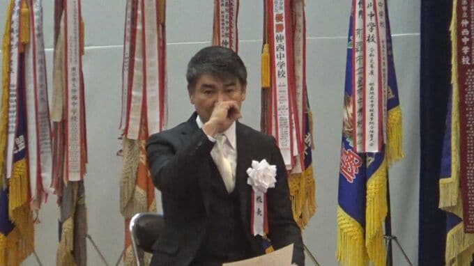 卒業生全員から別れの歌、そして仲西中学校の校歌が贈られると、平良校長の目には涙が…。溢れだす気持ちをこらえることはできませんでした。
