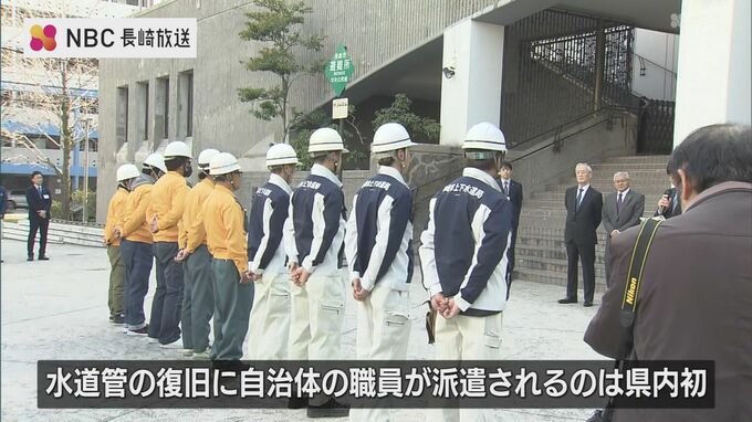 水道管の復旧に自治体の職員が派遣されるのは長崎県内ではこれが初めてで、民間の工事業者と共同チームを編成することで、一日も早い復旧を目指します。