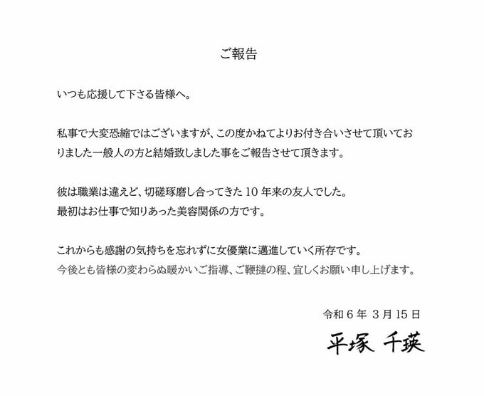 平塚さんは「私事で大変恐縮ですが、この度、結婚致しました。」と知らせ、「ありきたりな言葉かもしれませんが、手を取り合って幸せな家庭を築いていきたいと思います。」と思いを綴っています。
