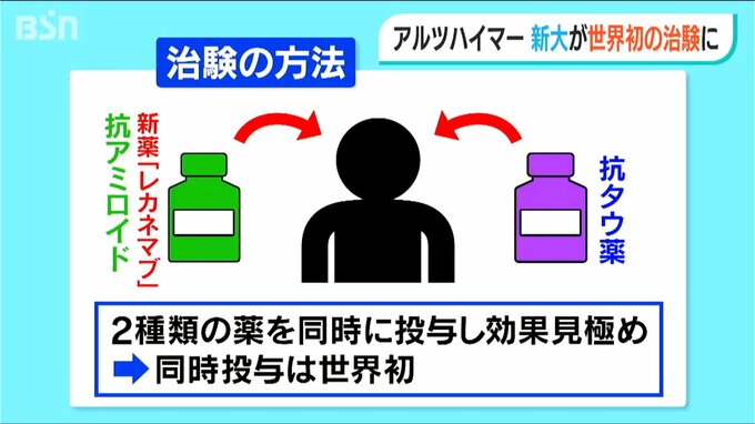 治験では原因物質である「アミロイド」と「タウ」、それぞれに対抗する2種類の薬を同時に投与して効果があるか見極めます。