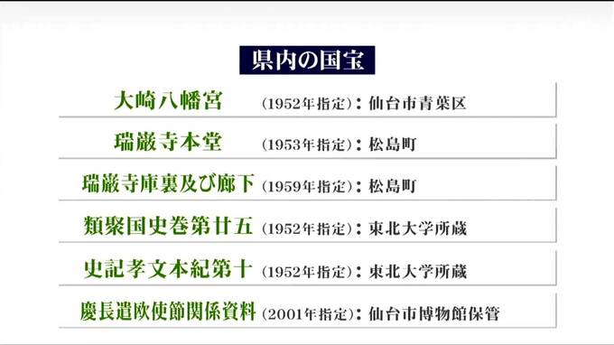 建造物では、伊達政宗が1607年に建てた青葉区の「大崎八幡宮」と1609年に建てた松島町の「瑞巌寺本堂」「庫裏及び廊下」。