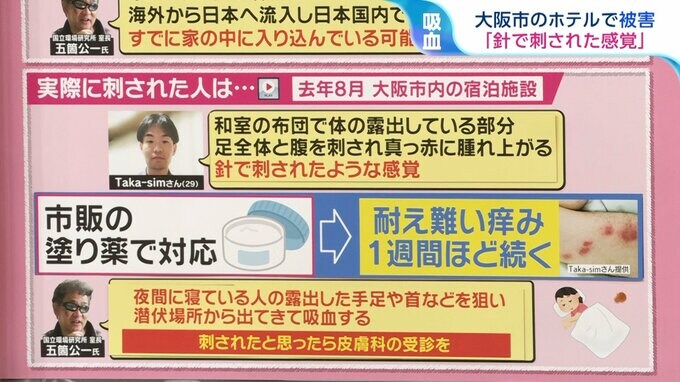 2023年8月、大阪市内の宿泊施設でトコジラミの被害に遭った方に話を聞きました。