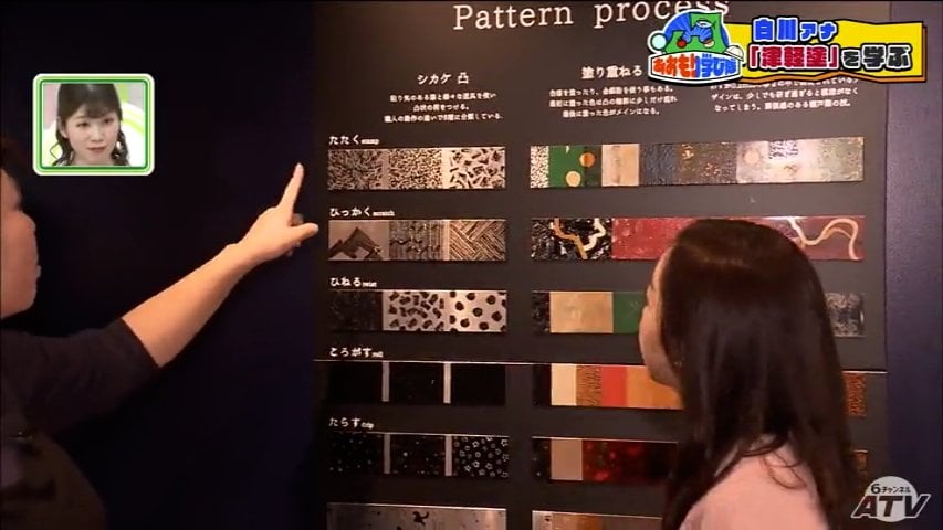 「こんなに模様がたくさんありますけれども、全部作り方が一緒です。研ぎ出し変わり塗りという技法なんですけれど」という葛西さん。