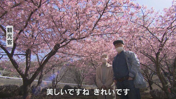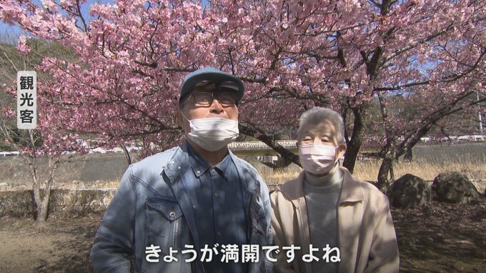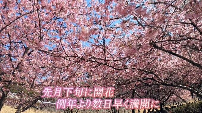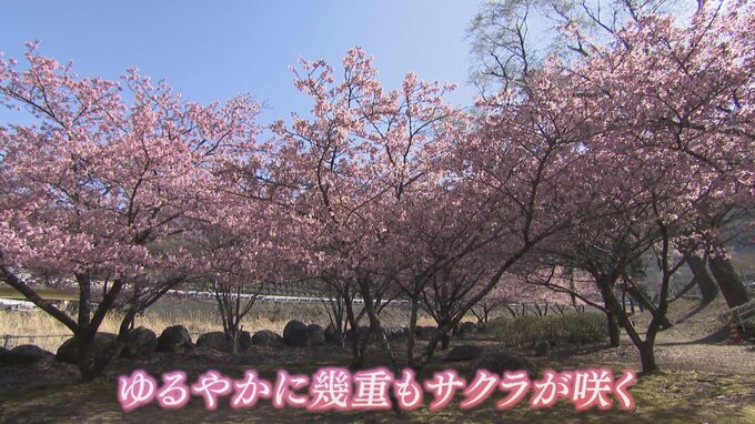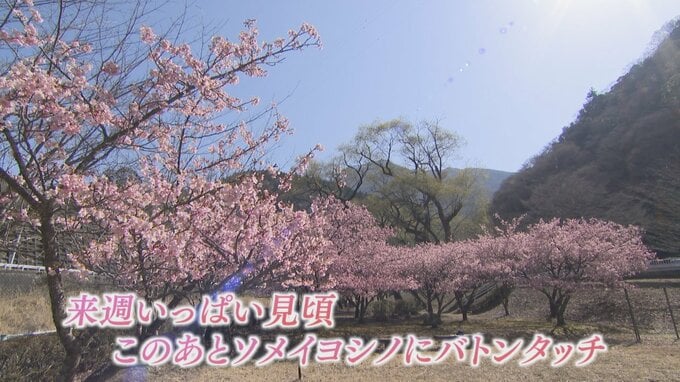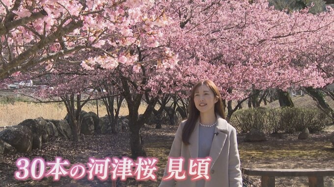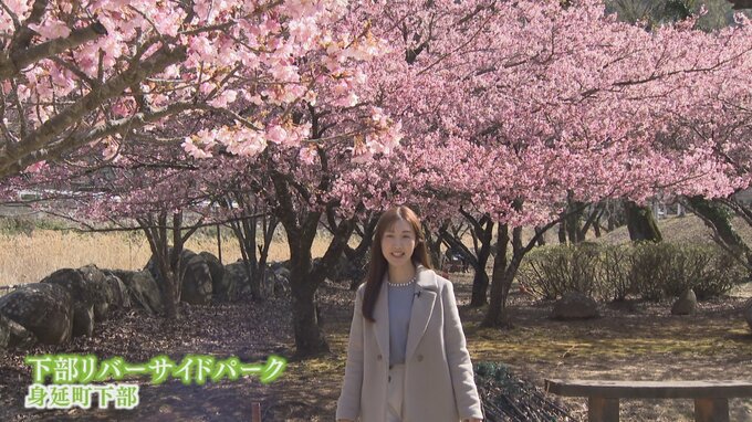 「身延町の下部リバーサイドパークです、30本の河津桜が見ごろを迎えています」