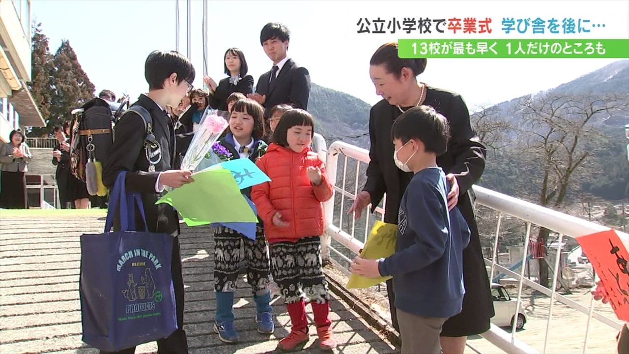 15日、山梨県内の公立小学校で最も早い卒業式が行われ、6年間の思い出が詰まった学び舎を後にしました。