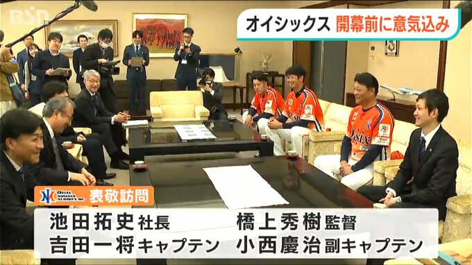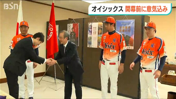 16日から開幕するプロ野球イースタンリーグに今シーズンから参入する『オイシックス新潟アルビレックス・ベースボール・クラブ』の監督や選手らが14日、初陣を前に花角英世知事を表敬訪問しました。