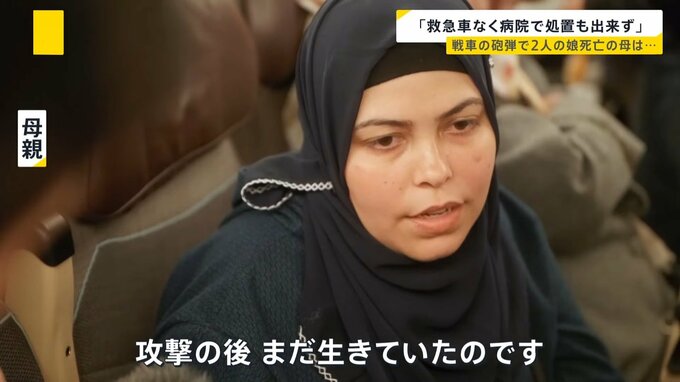 「2人の娘も同じ場所にいました。彼女たちも戦車の砲弾の破片にあたり、死にました。攻撃の後、まだ生きていたのです。周りの人々が人工呼吸をしようとしていたが、助からなかった。イスラエル軍は負傷者の外出も禁止しました。救急車もなく、負傷者を病院で応急処置することもできなかったのです」