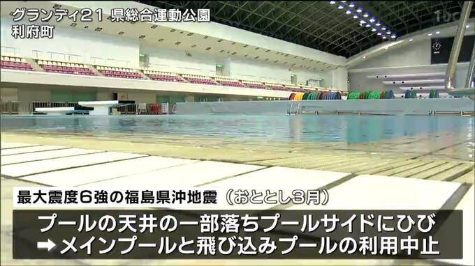 利府町の県総合運動公園=グランディ21では2022年3月、最大震度6強を観測した福島県沖の地震で、プールの天井の一部が落ちたほか、プールサイドにひびが入り50mのメインプールと飛び込みプールの利用を中止していました。