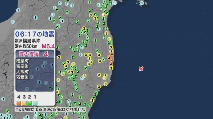 17日午前6時17分ごろ、福島県沖を震源とするやや強い地震がありました。楢葉町・富岡町・大熊町・双葉町で震度4を観測しましたが、県内で被害の情報は確認されていません。この地震による津波の心配はありません。…