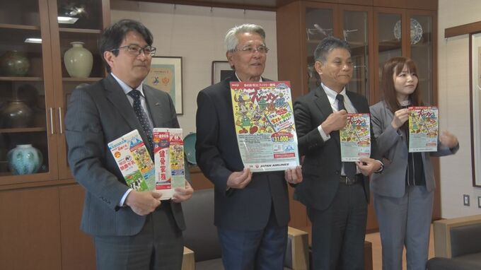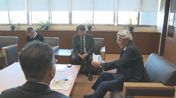 仲田和男社長らが宮古島市役所を訪れ、座喜味市長に5年ぶり2回目となる公演をPRしました。