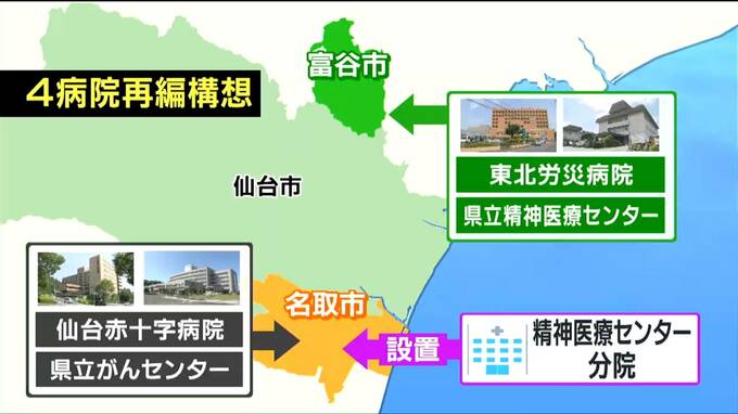宮城県が構想する仙台医療圏の4病院再編構想についてです。この構想は、仙台赤十字病院と県立がんセンターを統合して名取市に、東北労災病院と県立精神医療センターを併設して富谷市に移転し、名取市には医療センターの分院を置くものです。