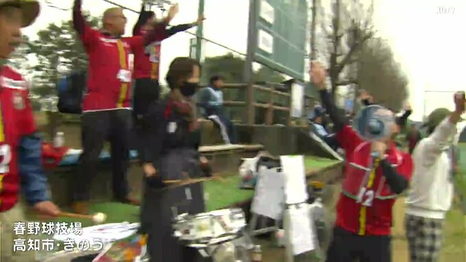 高知市の春野球技場には雨にも負けない熱いサポーター387人が詰めかけました。