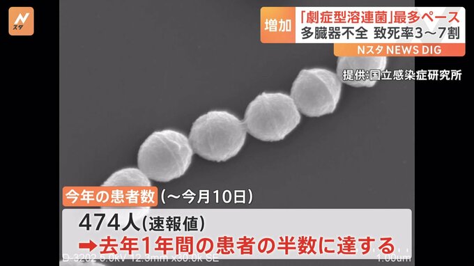 急速に症状が進み、致死率が高いことで知られる「劇症型溶血性レンサ球菌感染症」の今年に入ってからの患者数が、過去最多となった去年1年間の患者数の5割をすでに上回ったことがわかりました。「劇症型溶連菌」は…