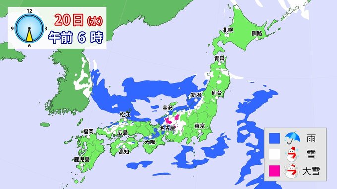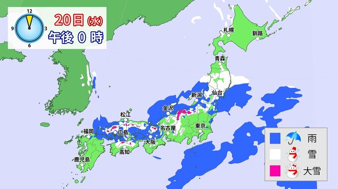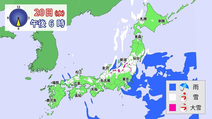 20日(水)~21日(木) 関東甲信地方で“大雪”の可能性 24日からは一転し各地で平年より2℃以上高い 寒暖差に注意 【今後の雪のシミュレーション】