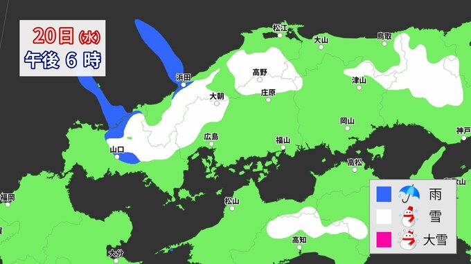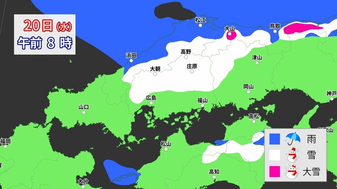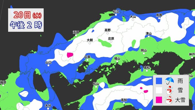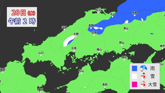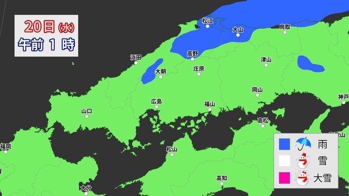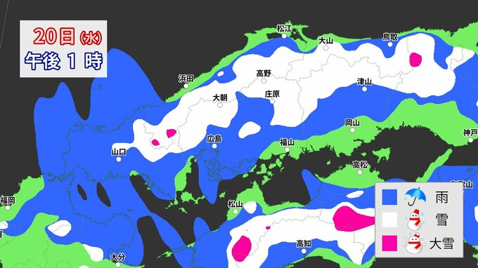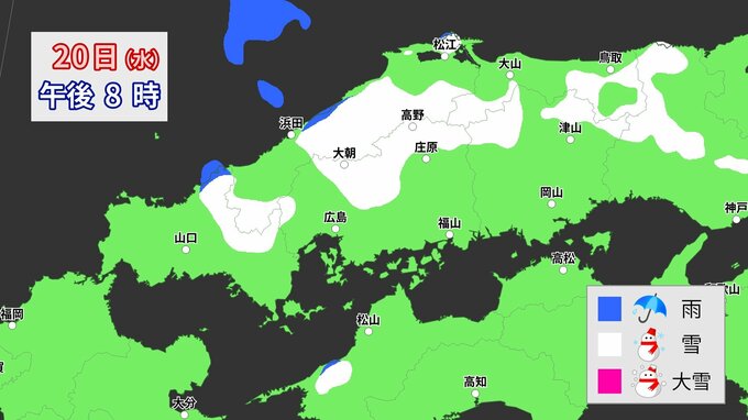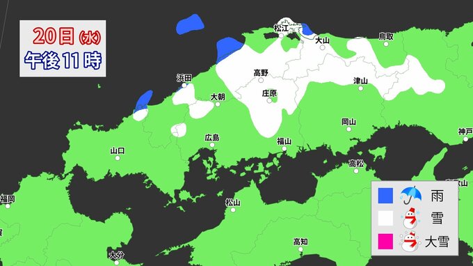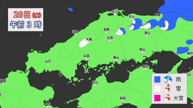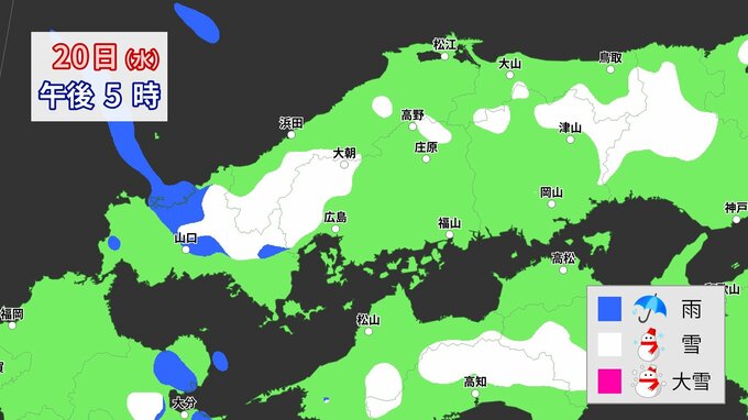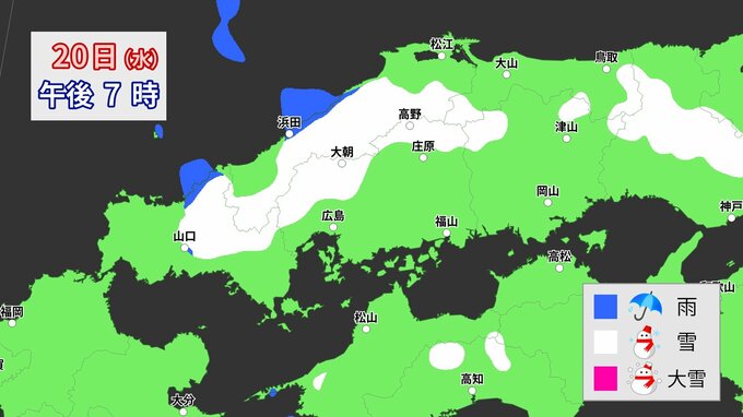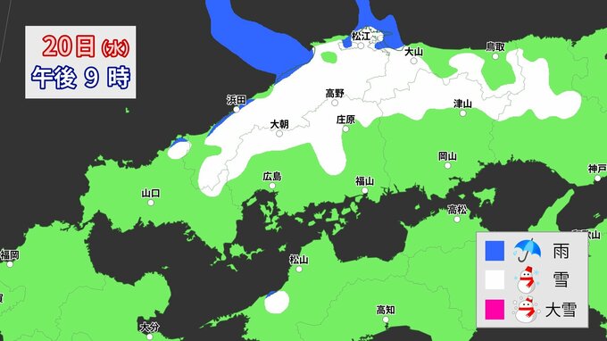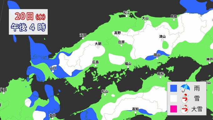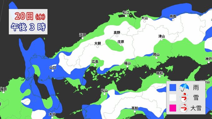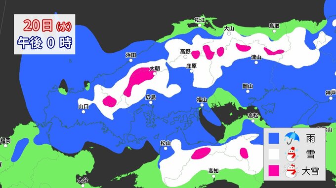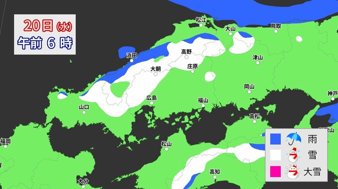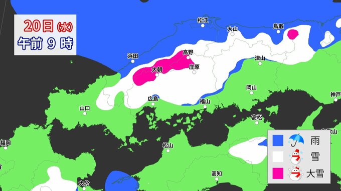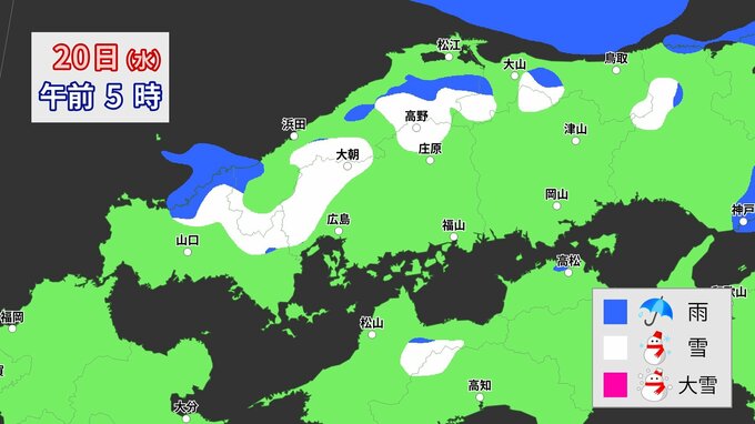 広島県に「強風・高波及び大雪に関する情報」発表 20日は山地で大雪に 上空にー36℃以下の強い寒気流入 大気の状態が非常に不安定 低気圧が急発達で強風・高波も 中国放送 2024年3月19日(火) 17:20 国内 天気 1時間ごとの詳しい降雪シミュレーション予想(20日)