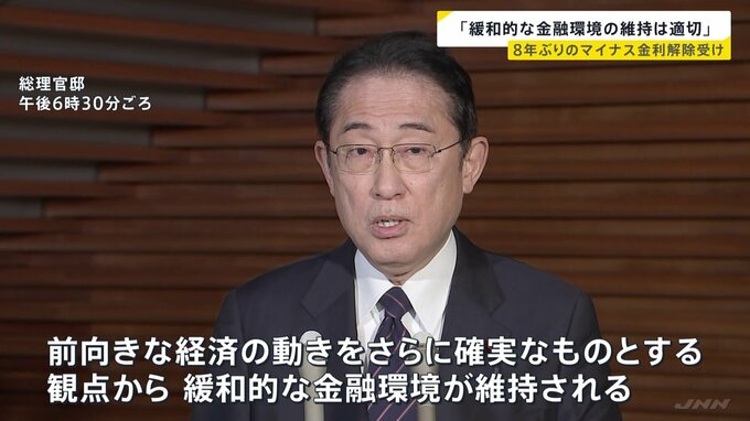 日銀が19日の金融政策決定会合で、8年続いたマイナス金利の解除を決めたことを受け、岸田総理は今夜、「緩和的な金融環境が維持されることになったのは適切」との認識を示しました。岸田総理「前向きな経済の動き…