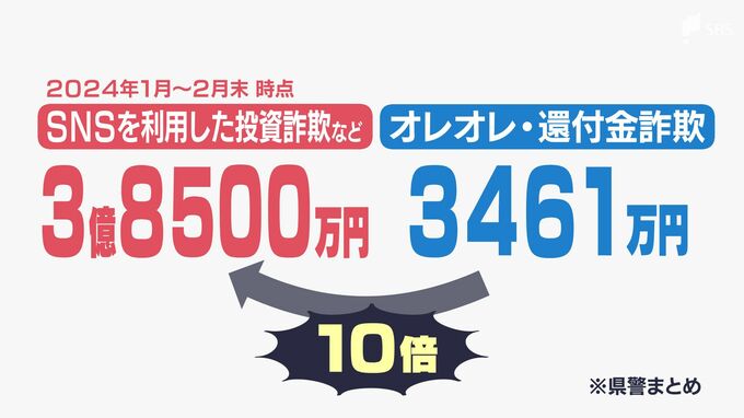 警察によりますと、2024年静岡県内で確認されたSNSを使用した投資、ロマンス詐欺は2月末時点で12件、被害額は3億8500万円に上っています。オレオレ詐欺などの特殊詐欺と比べると10倍以上となっています。