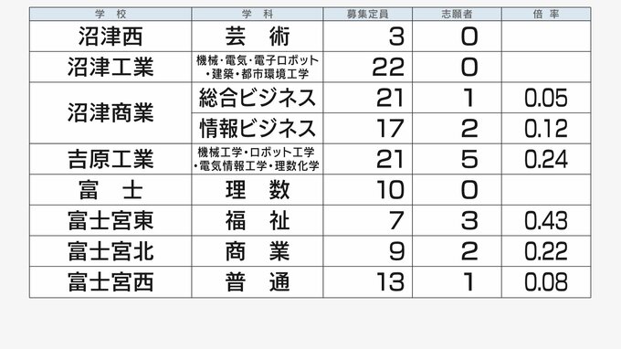 【3月19日発表=再募集】静岡県公立高校入試2024 志願倍率 全日制・定時制の全校掲載【令和6年度高校入試 出願状況】 静岡放送 2024年3月19日(火) 21:00 国内 【再募集の倍率は?全日制:東部】 ◇下田・南伊豆分校・松崎・稲取・熱海・土肥分校・伊豆中央・田方農業・御殿場・御殿場南 ◇沼津西・沼津工業・沼津商業・吉原工業・富士・富士宮東・富士宮北・富士宮西