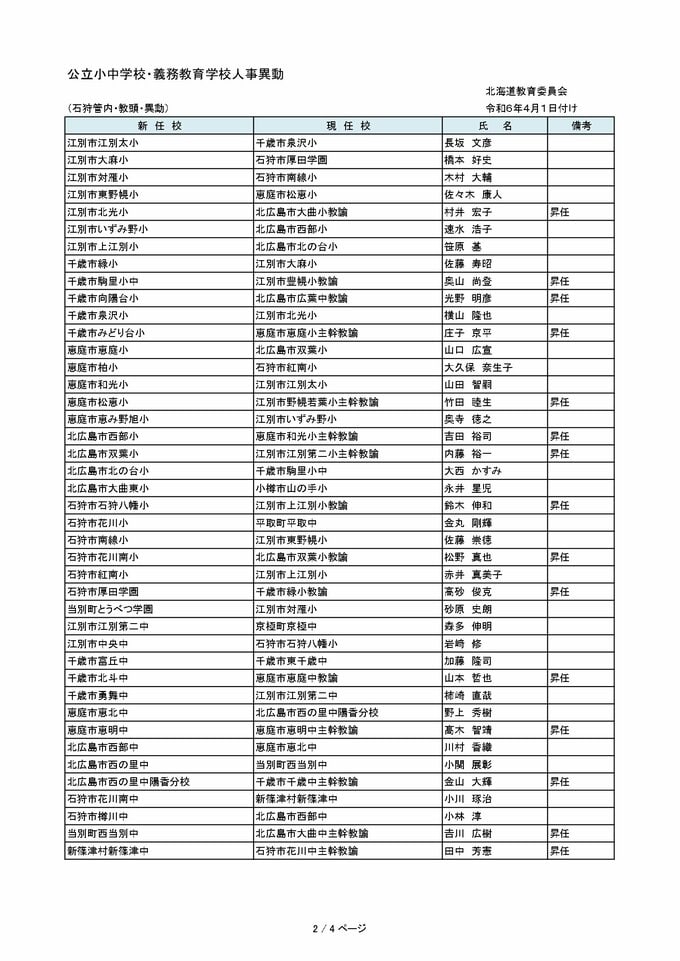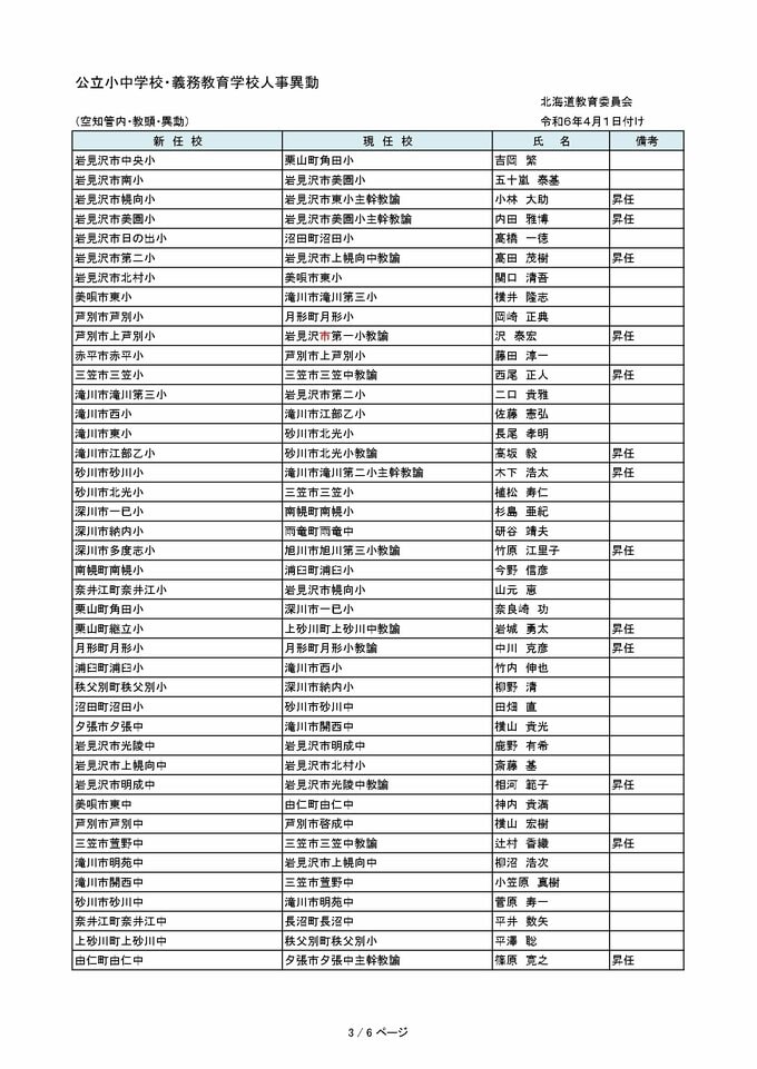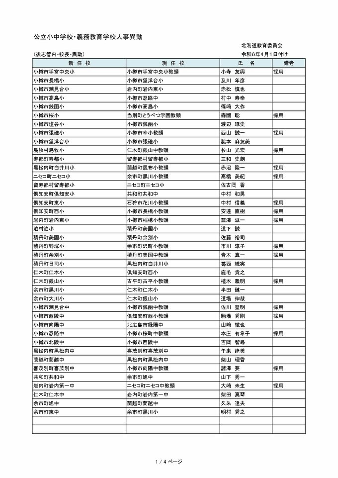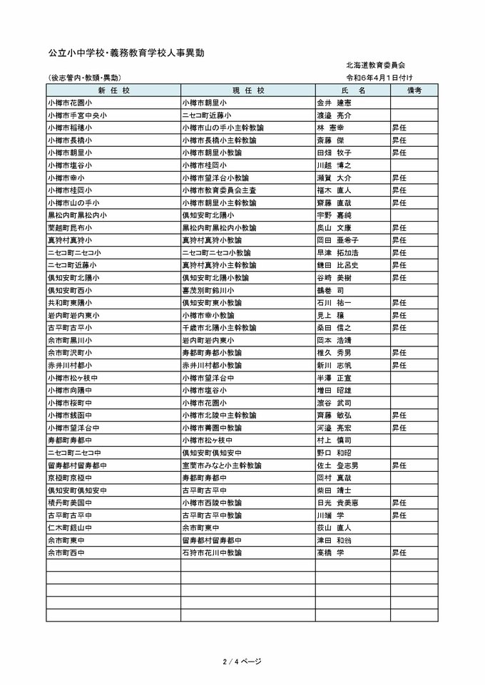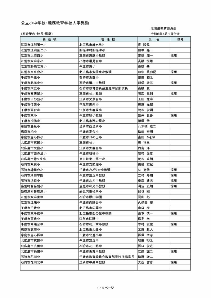 北海道教職員 人事異動2024「あの先生はどこへ?」~小・中学校の校長、教頭など人事異動全名簿(24日発表分) 北海道放送 2024年3月24日(日) 00:00 国内 【空知管内 公立小中学校・義務教育学校(校長・教頭)】 【石狩管内 公立小中学校・義務教育学校(校長・教頭)】 後志管内 公立小中学校・義務教育学校(校長・教頭)