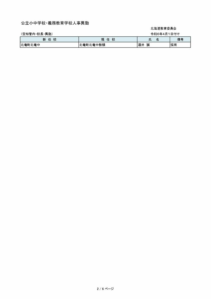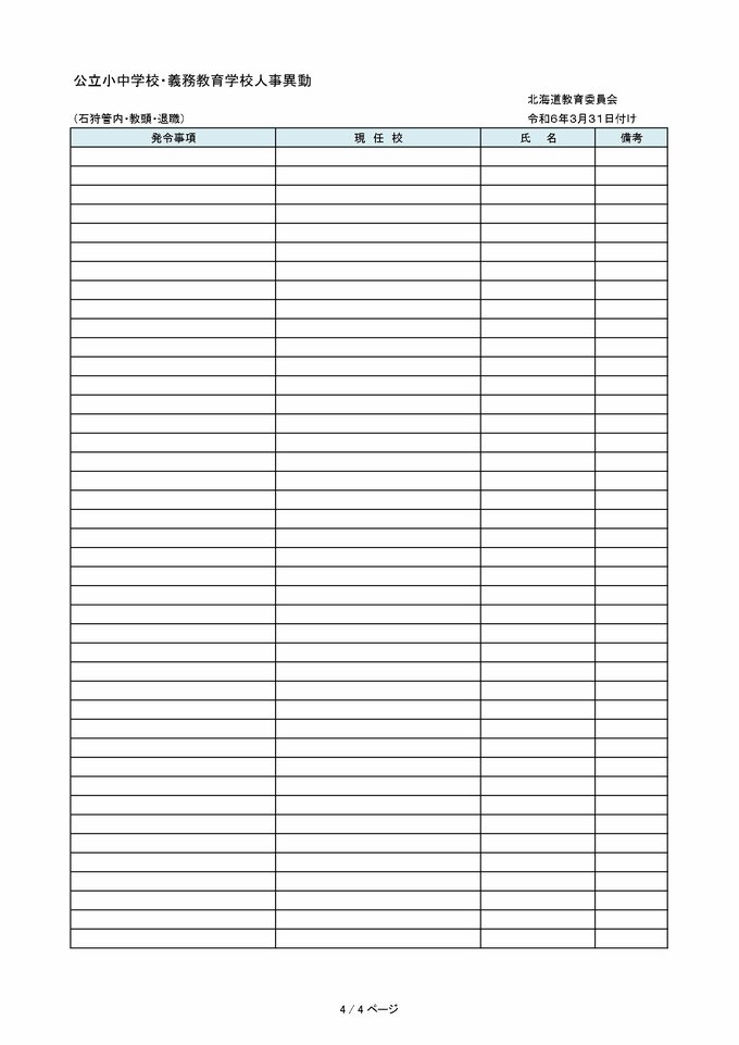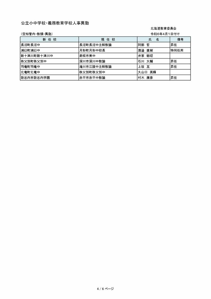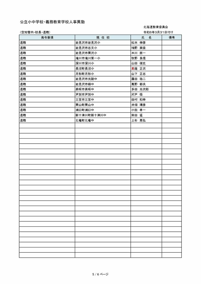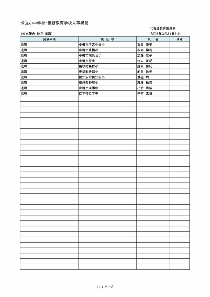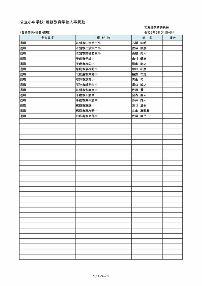 北海道教職員 人事異動2024「あの先生はどこへ?」~小・中学校の校長、教頭など人事異動全名簿(24日発表分) 北海道放送 2024年3月24日(日) 00:00 国内 【空知管内 公立小中学校・義務教育学校(校長・教頭)】 【石狩管内 公立小中学校・義務教育学校(校長・教頭)】 後志管内 公立小中学校・義務教育学校(校長・教頭)