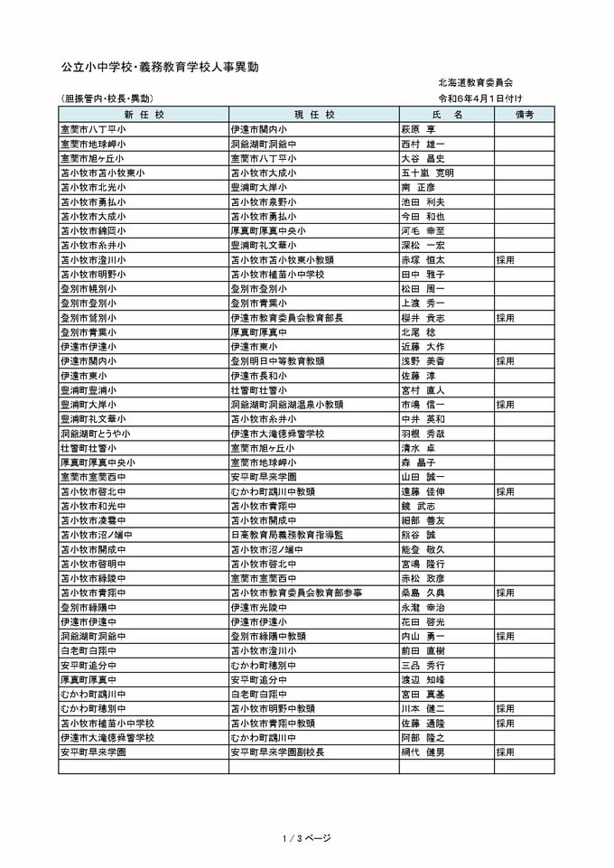 北海道教職員 人事異動2024「あの先生はどこへ?」~小・中学校の校長、教頭など人事異動全名簿(24日発表分) 北海道放送 2024年3月24日(日) 00:00 国内 【胆振管内 公立小中学校・義務教育学校(校長・教頭)】 【日髙管内 公立小中学校・義務教育学校(校長・教頭)】 【渡島管内 公立小中学校・義務教育学校(校長・教頭)】