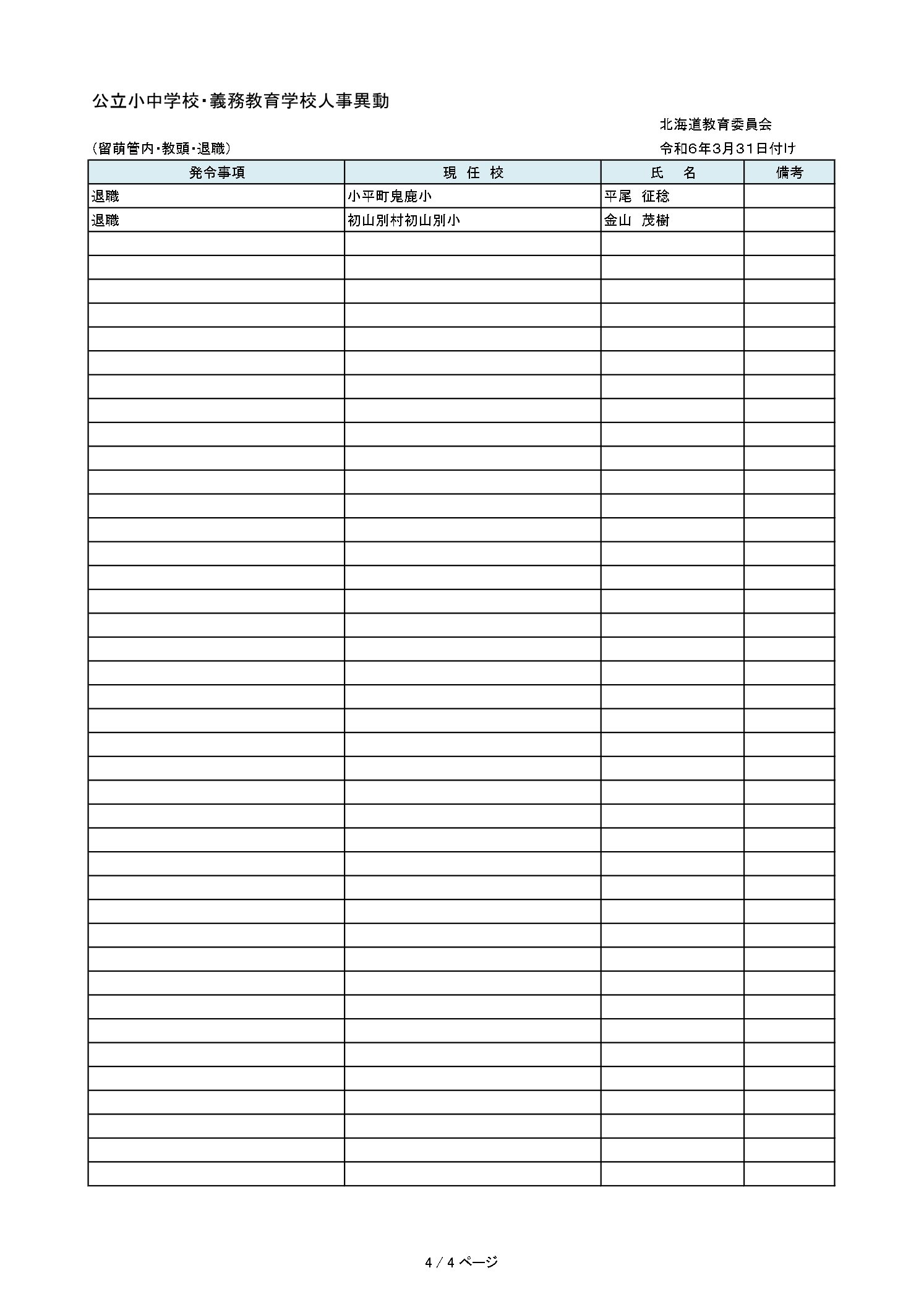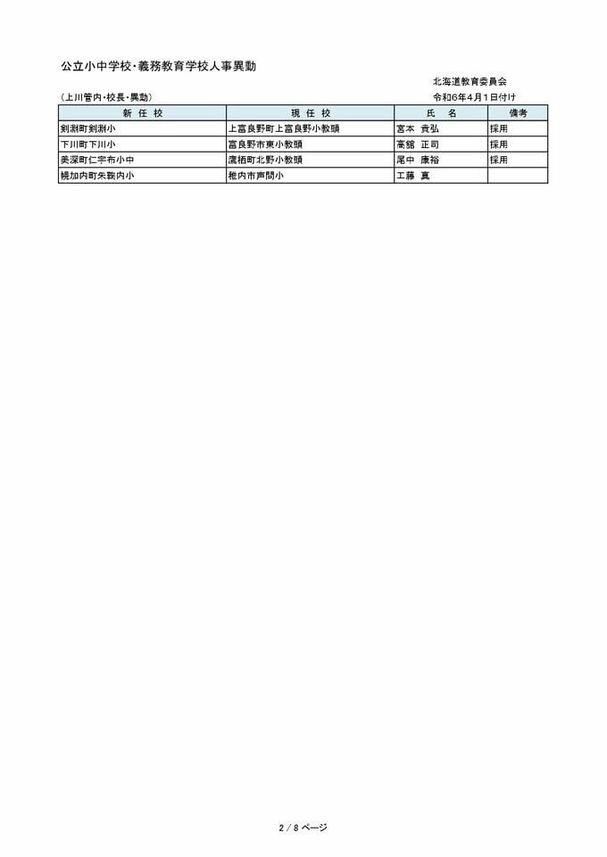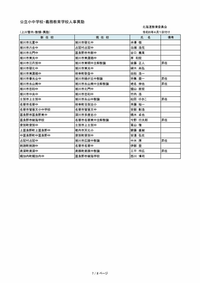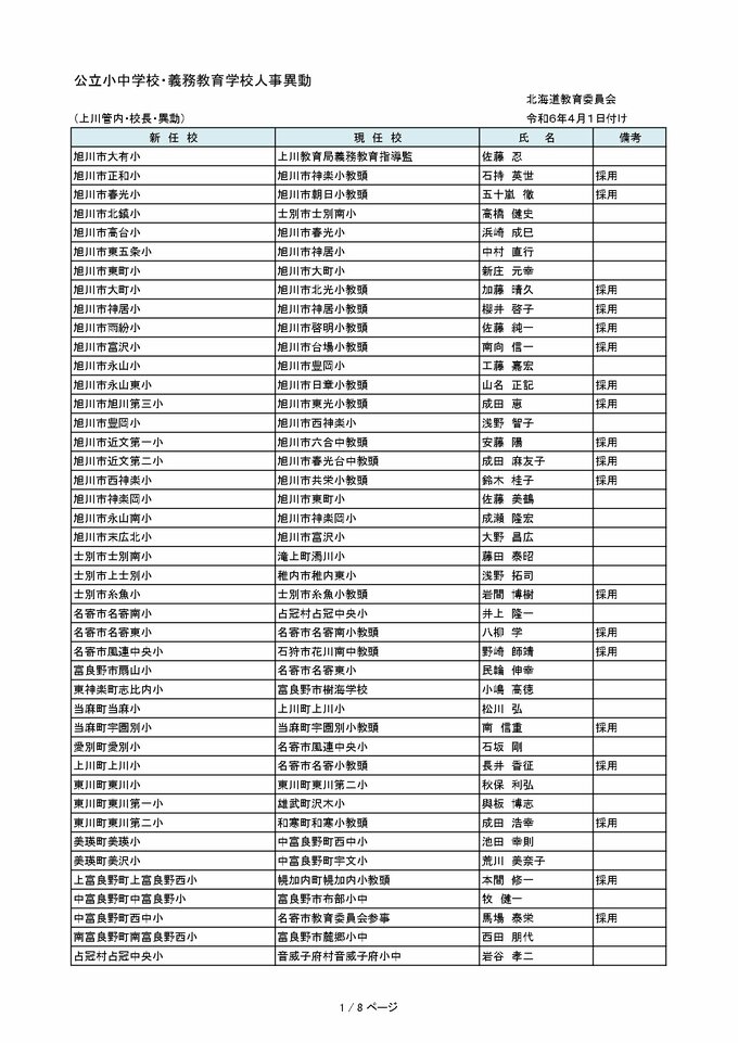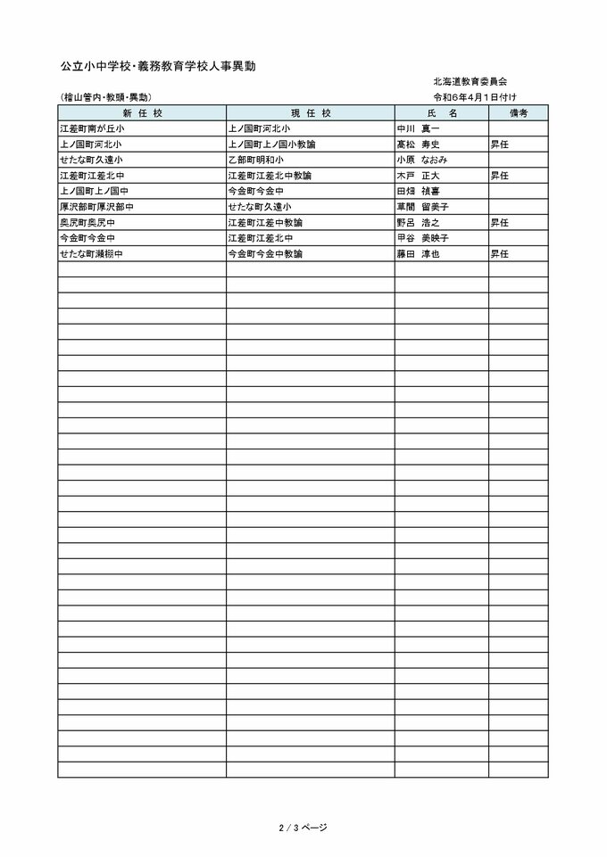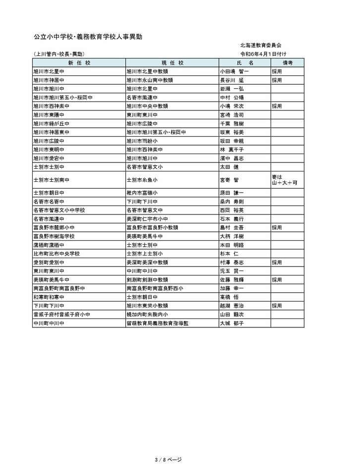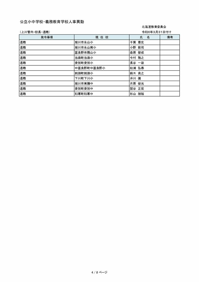 北海道教職員 人事異動2024「あの先生はどこへ?」~小・中学校の校長、教頭など人事異動全名簿(24日発表分) 北海道放送 2024年3月24日(日) 00:00 国内 【檜山管内 公立小中学校・義務教育学校(校長・教頭)】 【上川管内 公立小中学校・義務教育学校(校長・教頭)】 【留萌管内 公立小中学校・義務教育学校(校長・教頭)】