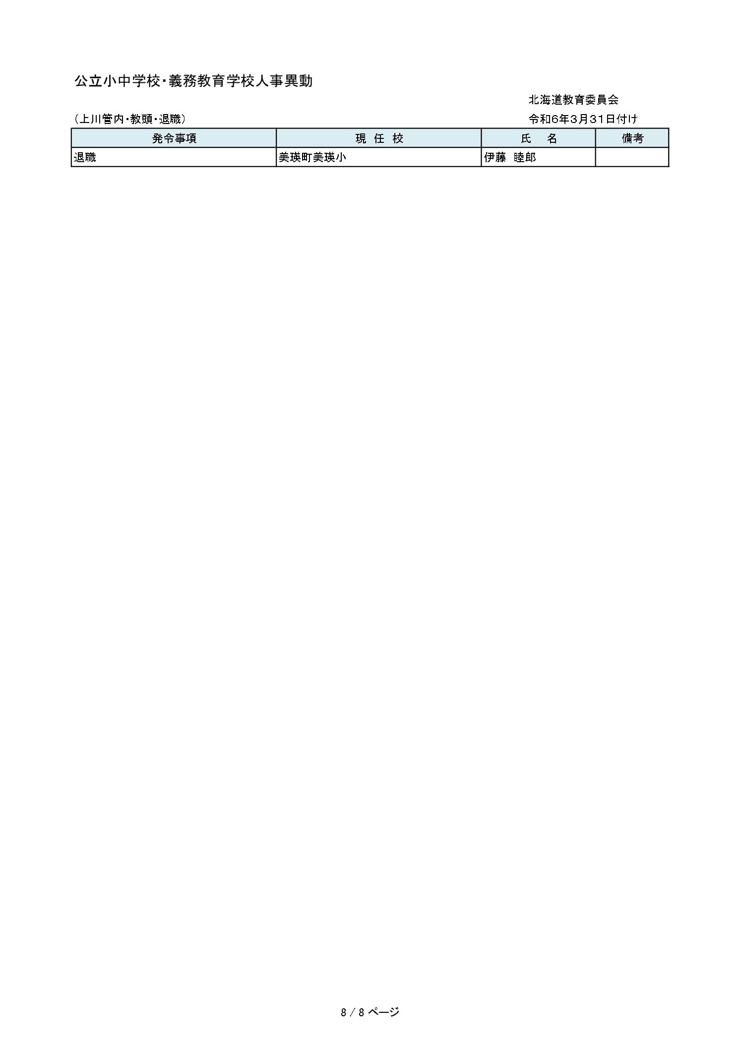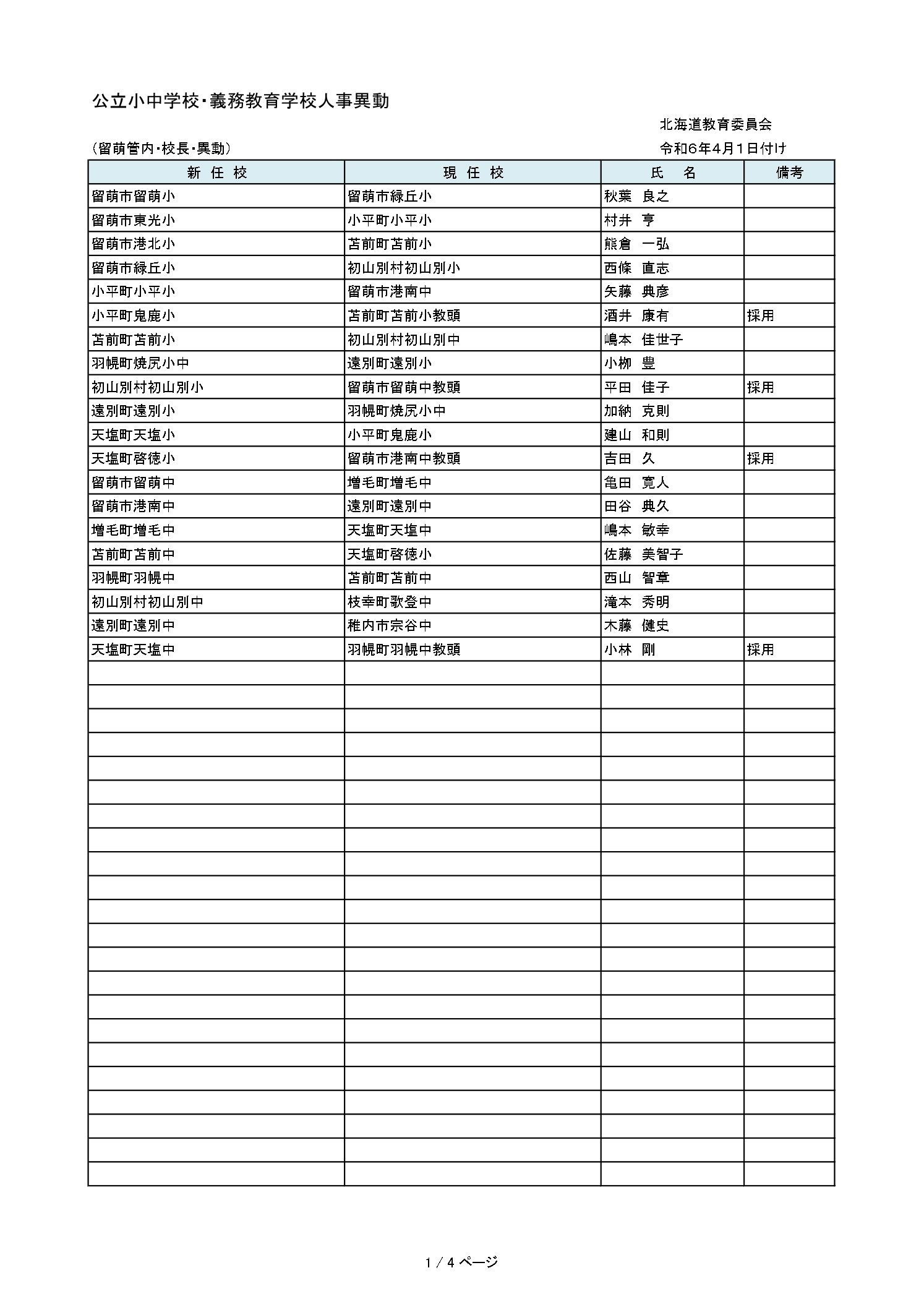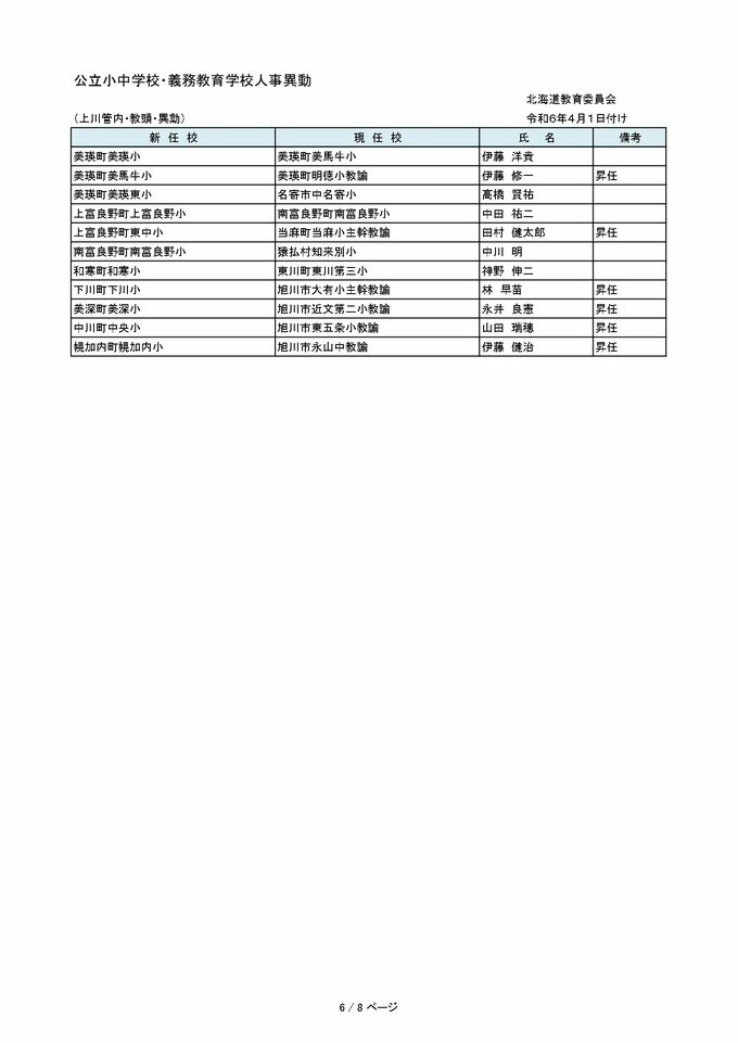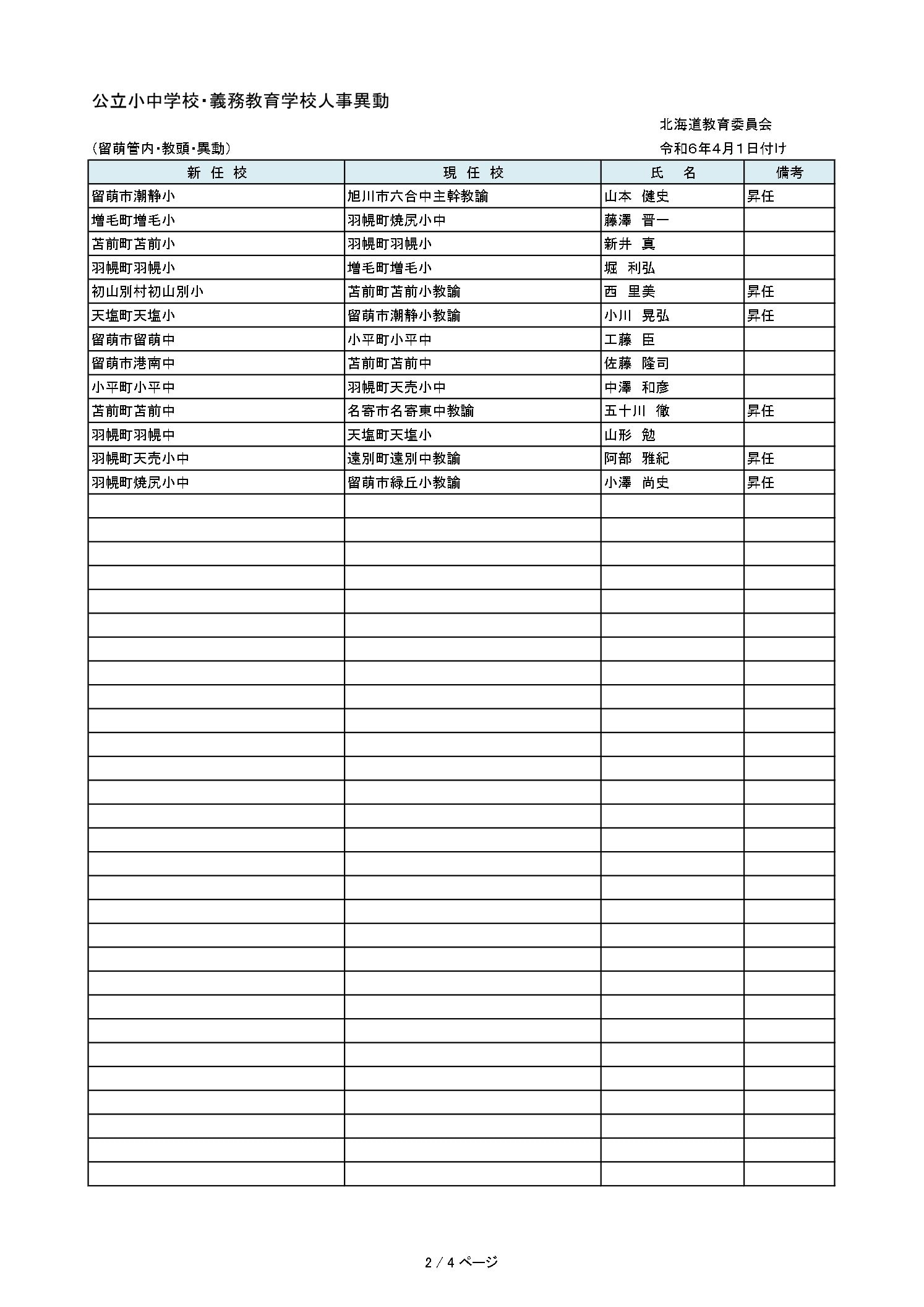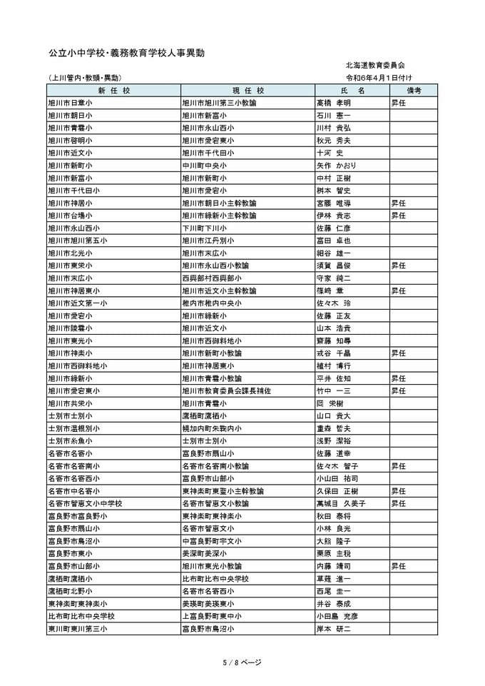 北海道教職員 人事異動2024「あの先生はどこへ?」~小・中学校の校長、教頭など人事異動全名簿(24日発表分) 北海道放送 2024年3月24日(日) 00:00 国内 【檜山管内 公立小中学校・義務教育学校(校長・教頭)】 【上川管内 公立小中学校・義務教育学校(校長・教頭)】 【留萌管内 公立小中学校・義務教育学校(校長・教頭)】
