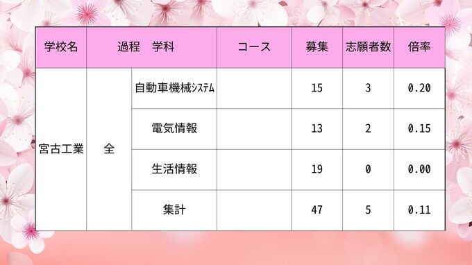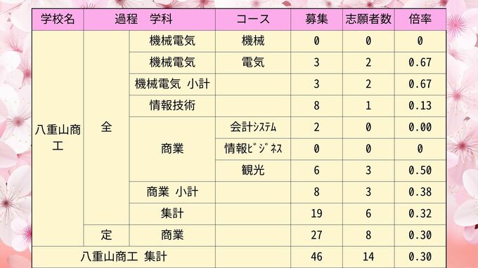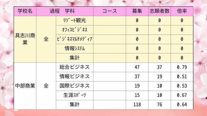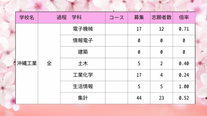 【全校掲載】沖縄県県立高校入試2024 第2次募集最終志願倍率 普天間や那覇西など初回から倍率変動 琉球放送 2024年3月20日(水) 10:48 国内 沖縄工業・南部工業・宮古工業・八重山商工・具志川商業・中部商業