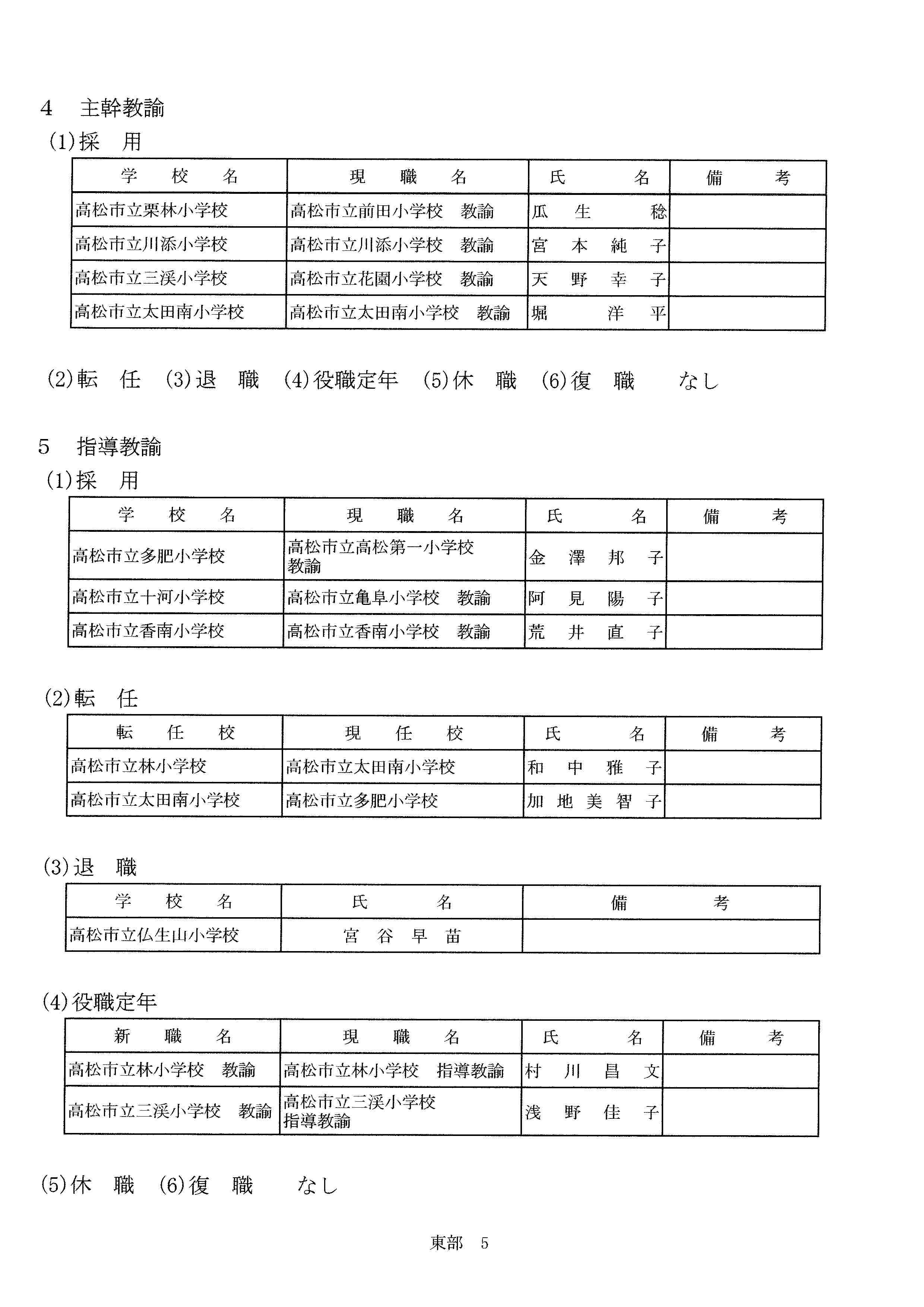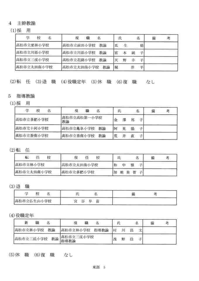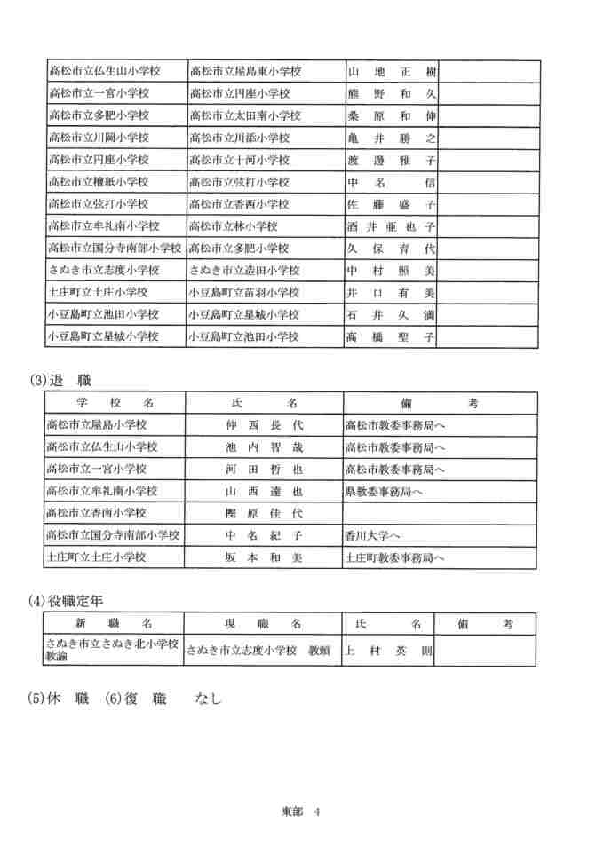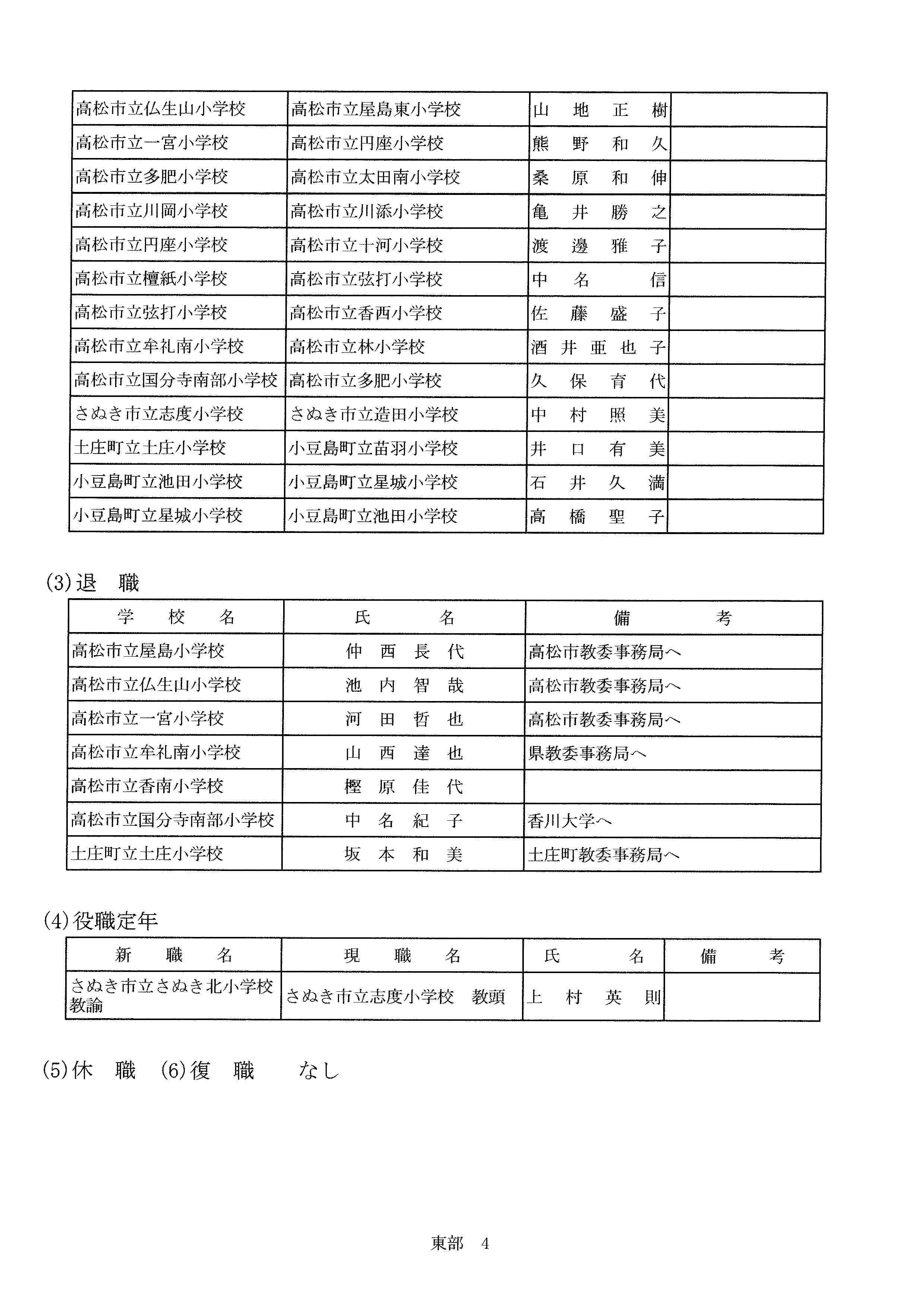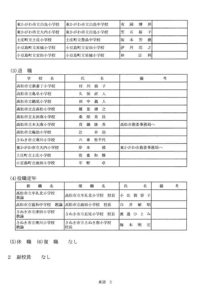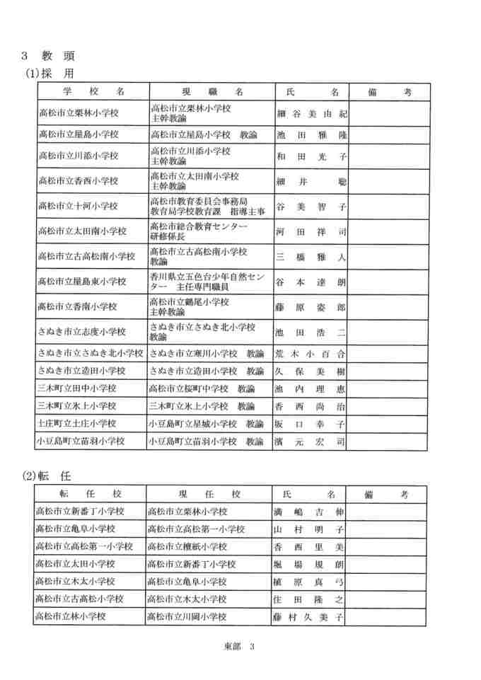 香川県 公立小中高校・教員「あの先生、どこ行ったんかいのぅ」教職員人事異動情報【2024】 RSK山陽放送 2024年3月21日(木) 13:00 国内 東部(高松市・さぬき市・東かがわ市・木田郡・香川郡・小豆郡)公立小学校 校長・副校長・教頭等 東部の公立小学校の校長・副校長・教頭・主幹教諭・指導教諭は、【画像31~35】の通りです。 【画像31】 【画像32】 【画像33】 【画像34】 【画像35】