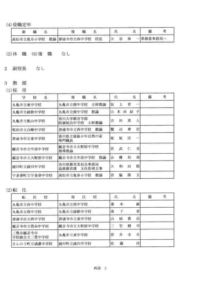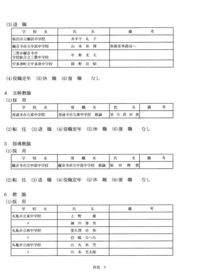 香川県 公立小中高校・教員「あの先生、どこ行ったんかいのぅ」教職員人事異動情報【2024】 RSK山陽放送 2024年3月21日(木) 13:00 国内 西部(丸亀市・坂出市・善通寺市・観音寺市・三豊市・綾歌郡・仲多度郡)公立中学校 校長・副校長・教頭等 西部の公立中学校の校長・副校長・教頭等は【画像86~88】の通りです。 【画像86】 【画像87】 【画像88】