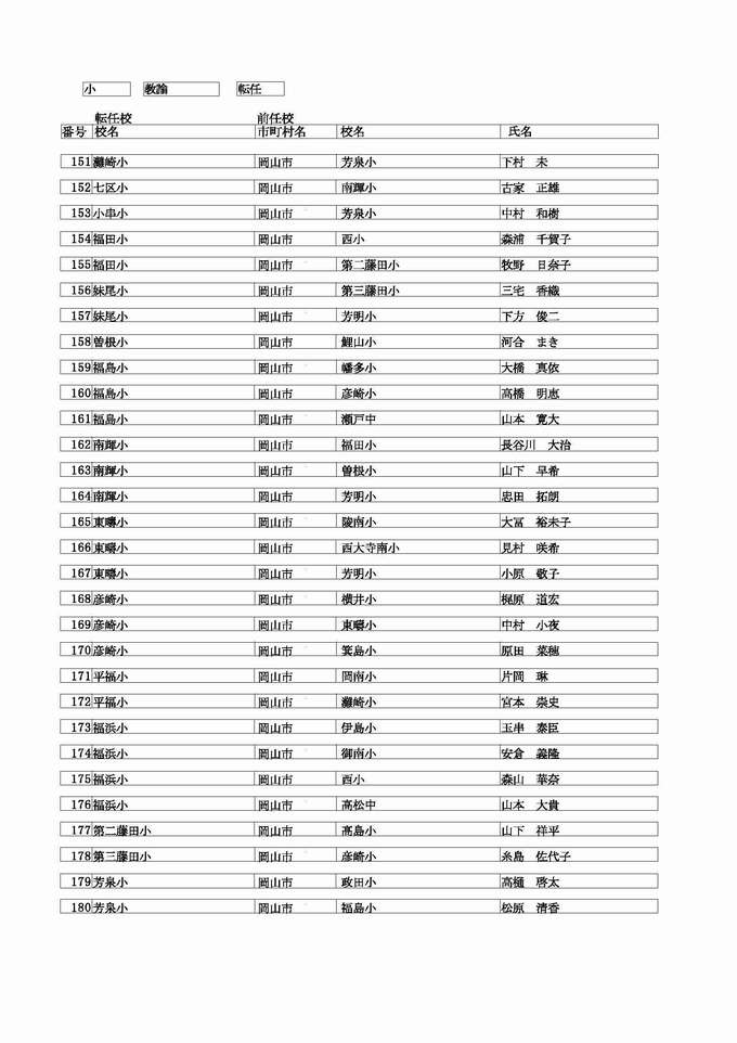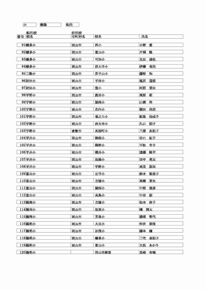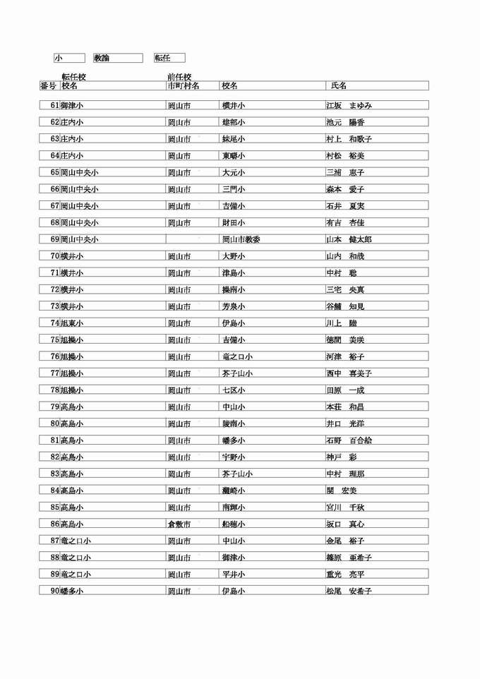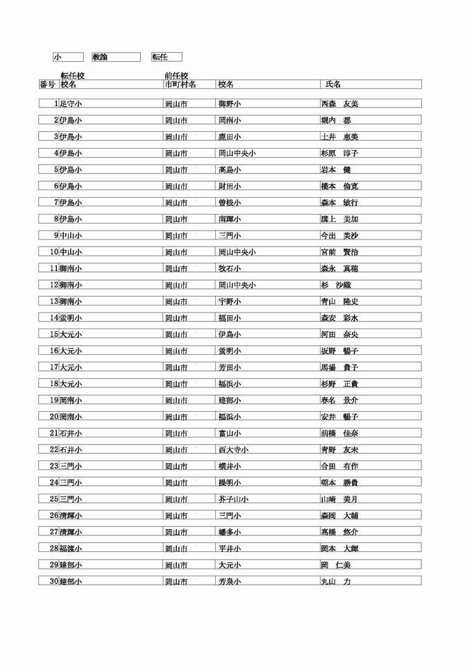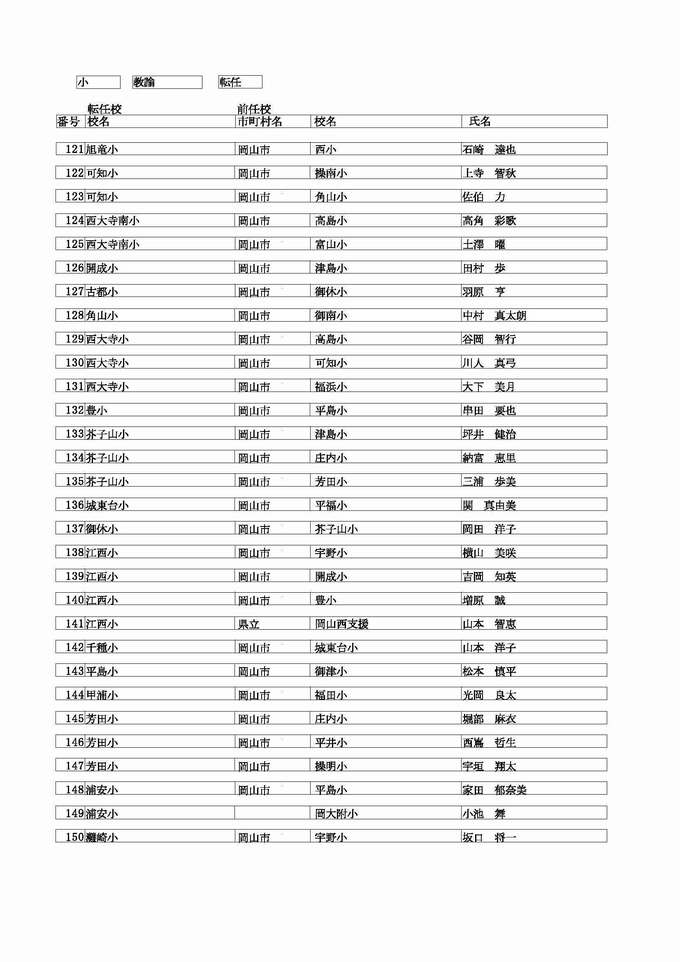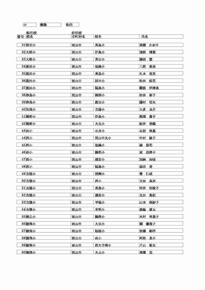 <小学校 教諭 転任>( )内は前任校