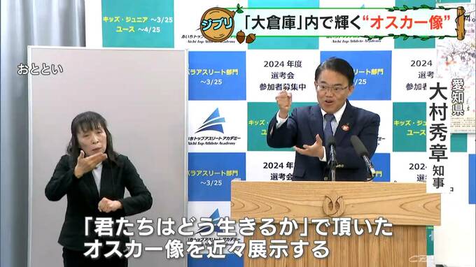 「スタジオジブリのご厚意で、しばらくの間、ジブリパークにこの『君たちはどう生きるか』でいただいたオスカー像を近々から展示する。みなさん乞うご期待」