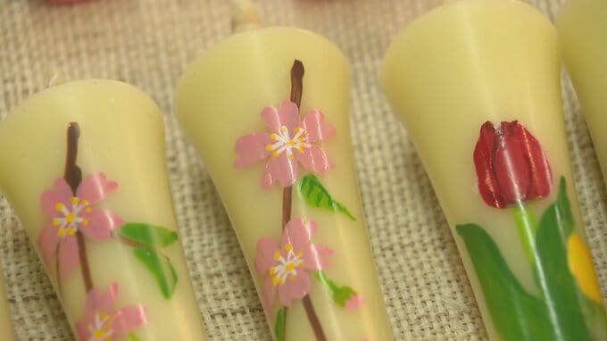 和ろうそくに描かれているのは、春の訪れを感じさせるサクラ。そして、可憐なチューリップ。職人たちの手でひとつひとつ作られる、この「七尾和ろうそく」は、石川県の希少伝統工芸品に指定されています。