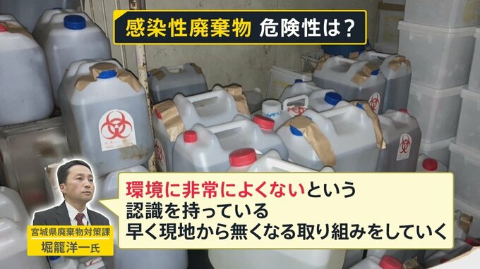 取材では現場の環境への影響がどのようなものだったか分かりませんでしたが、宮城県産業廃棄物対策課・堀籠洋一氏は「環境に非常によくないという認識を持っている。早く現地から無くなる取り組みをしていく」と、環境への悪影響を懸念していて、医療機関に回収を求めているという現状です。