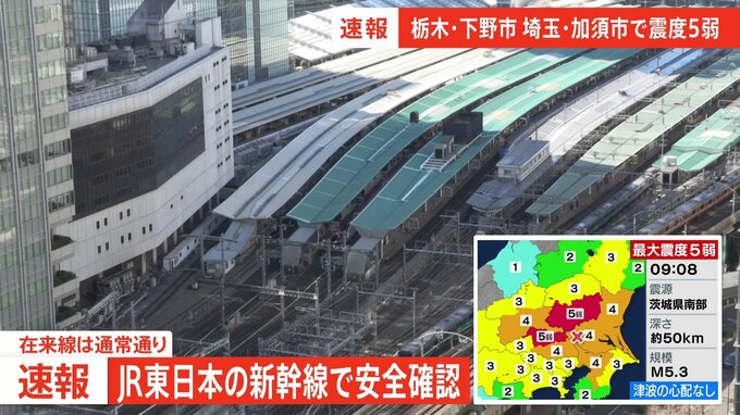 JR東日本によりますと、さきほどの地震で新幹線は安全確認のため運転を見合わせているということです。また、在来線で運転を見合わせている路線はなく、通常通り運行しているということです。