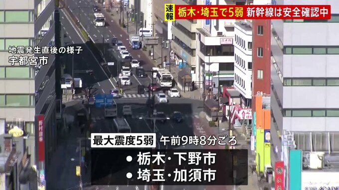 きょう午前9時すぎ、栃木県南部と埼玉県北部で震度5弱を観測する地震がありました。この地震による津波の心配はありません。気象庁によりますと、午前9時8分ごろ、最大震度5弱の揺れを栃木県下野市と埼玉県加須市…