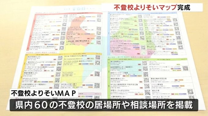 この「不登校よりそいマップ」は、民間団体の「県不登校を考えるネットワーク」が作成したもので、マップには、県内60か所の不登校の居場所や相談場所が地区ごとに掲載されています。