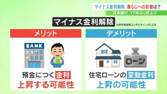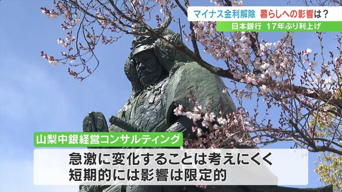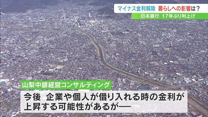 県内経済への影響について山梨中銀経営コンサルティングは、今後企業や個人が借り入れる時の金利が上昇する可能性があるが、急激に変化することは考えにくく、短期的には影響は限定的という見方を示しています。