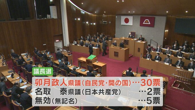 所信表明したのは2人で、投票の結果、最大会派=自民党・開の国の卯月政人県議が30票、日本共産党の名取泰県議が2票、無効5票で、卯月県議が新たな議長に就任しました。