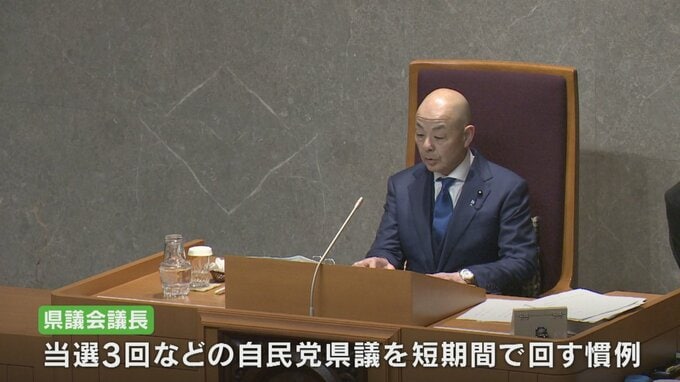 議長ポストは当選3回などの自民党の県議を短期間で回す慣例があり、今回もこれに沿った形で議長交代が行われました。