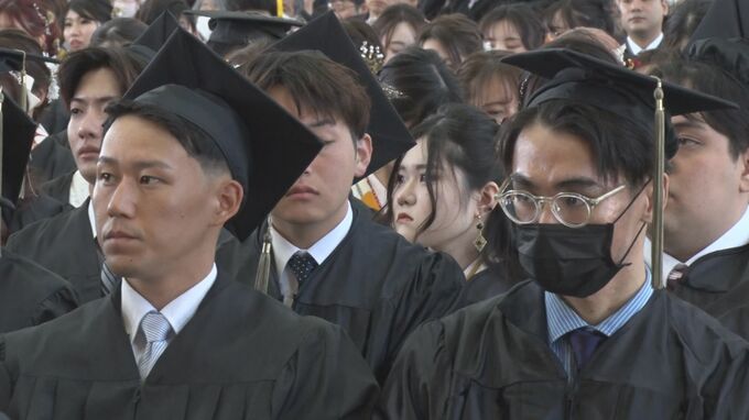 大学体育館で行われた卒業式には、卒業生や父母らが出席しました。