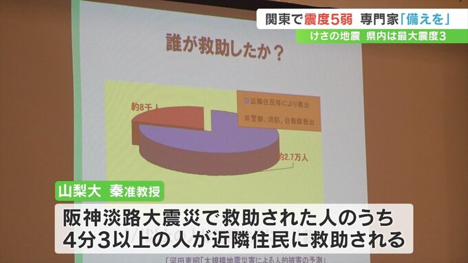 講演で秦准教授は、阪神淡路大震災で救助された人のうち、4分の3以上の人が近隣の住民に救助されていることから、大きな災害が発生したときは自分の身は自分で守り地域で支え合う、自助・共助が重要だと述べました。
