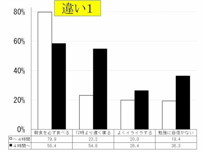 竹内准教授は、この「4時間以上ネット接続(以下、「4時間以上」)」の子どもたちに注目した。例えば夜12時より遅く寝る「4時間以上」の子は半数を超えて54.8%。「4時間未満」の子の2倍以上いた。そして「4時間以上」の子は「よくイライラする」と回答した割合も6ポイント高く26.4%。4人に1人は「よくイライラ」していた。